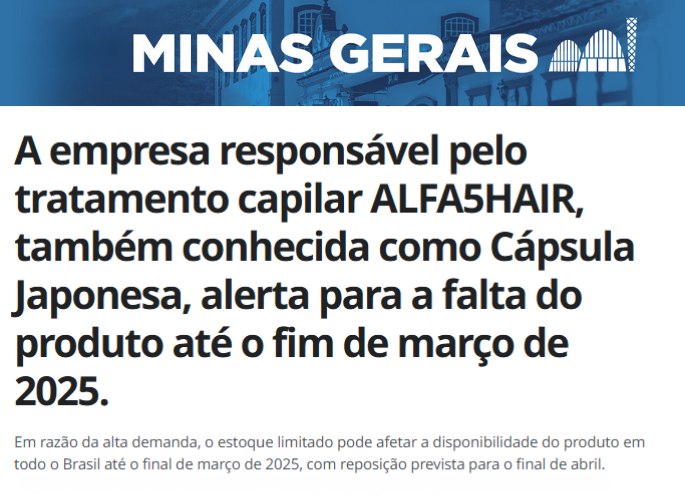 A empresa responsável pelo tratamento capilar ALFA5HAIR, popularmente conhecido como Cápsula Japonesa, emitiu um alerta sobre a possível falta do produto até o fim de março.